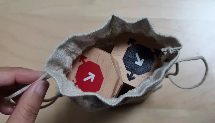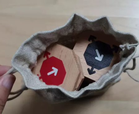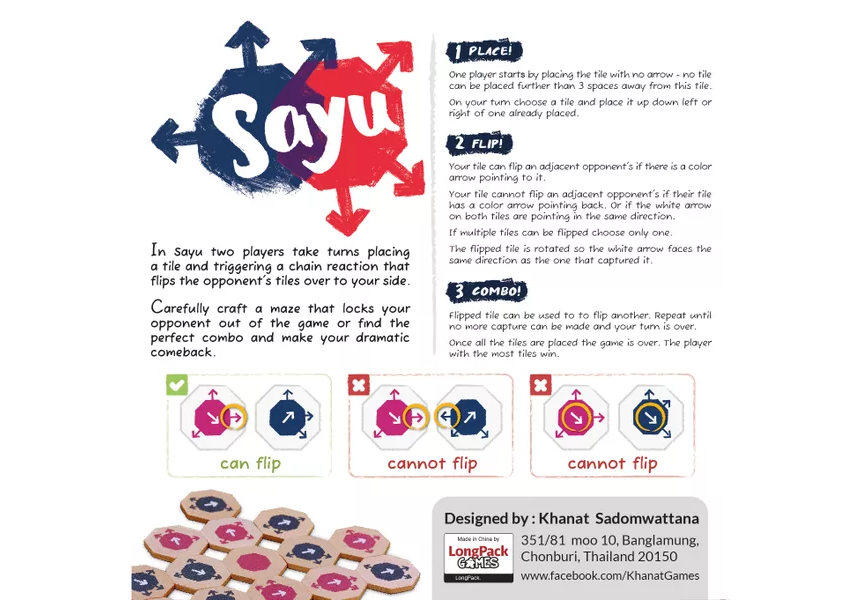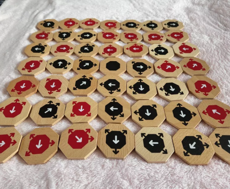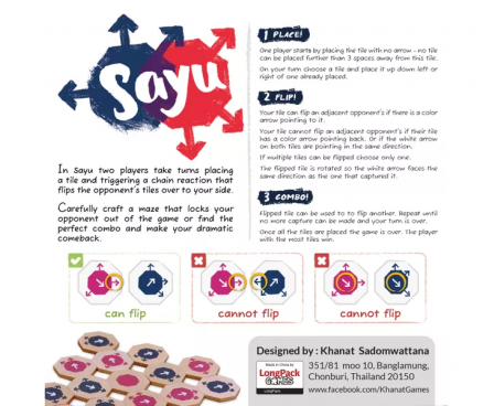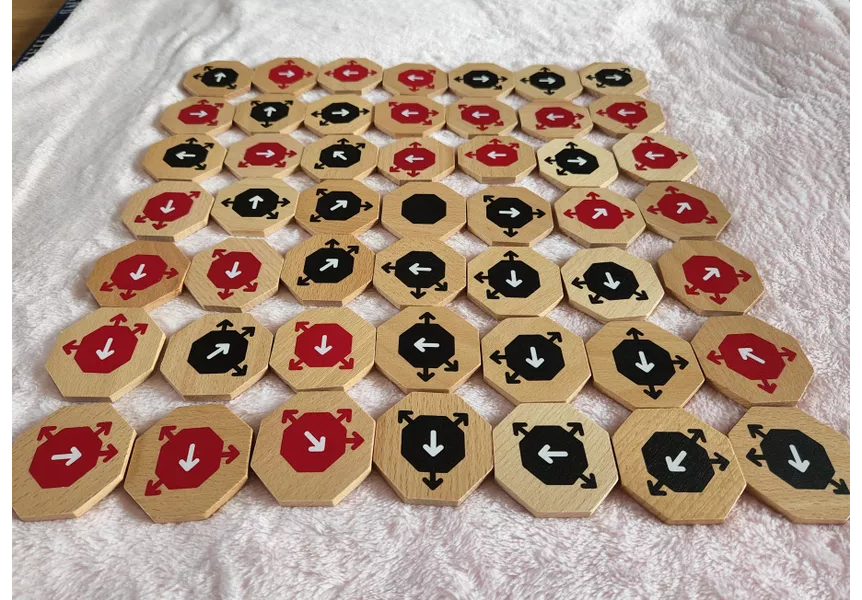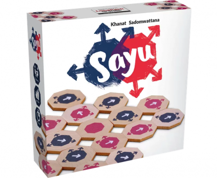 Sayū is an abstract strategy tile-laying, tile-flipping for two players. It is played with 49 unique two-sided octagonal wooden tiles and uses no board. The objective of the game is to have more tile of your color face up when all the tiles are placed.