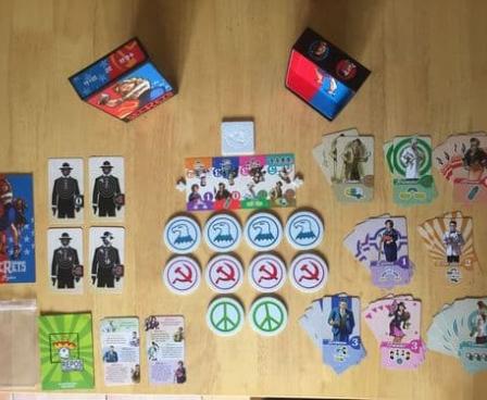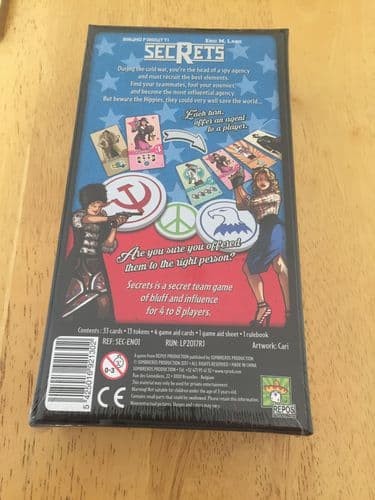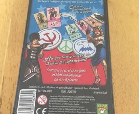 In Secrets, the second co-design between Eric Lang and Bruno Faidutti, players are assigned a hidden team '' the CIA or KGB '' and are trying to collect the most points for their side. In addition, one or two players are secretly anti-establishment Hippies who are working for nobody. Their goal is to fight the Man and have the fewest points.
