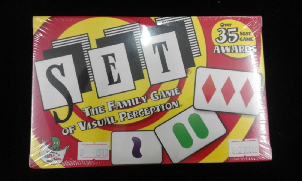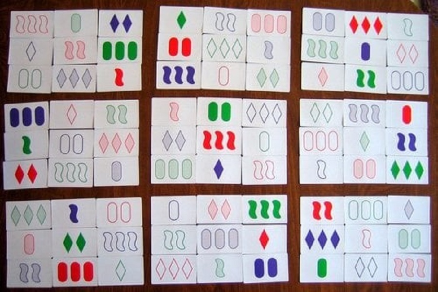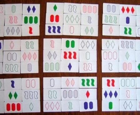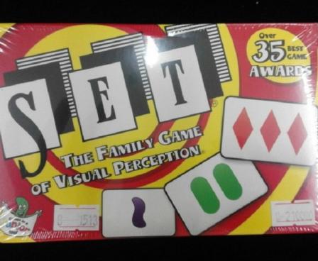 In SET, each card contains 1-3 objects, with all of the objects on a card having the same color, shape and shading, e.g., two purple shaded ovals. Colors, shapes, and shadings come in three different types: green, purple and red; oval, diamond and squiggle; and solid, shaded and outlined.