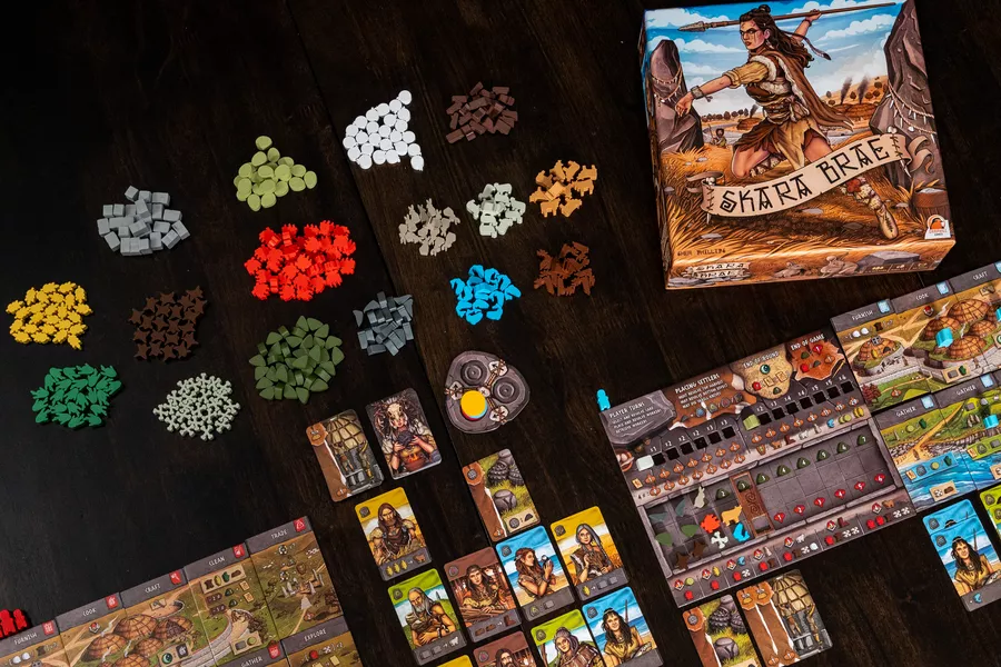 The aim of Skara Brae is to gather various resources in order to feed, clothe, and shelter the growing number of settlers. Players take turns drafting cards and using their workers to furnish, cook, craft, clean, and trade. At the end of each round, players need to provide for their settlers and will likely create more midden that needs to be cleaned up. After four rounds, the player with the most points wins