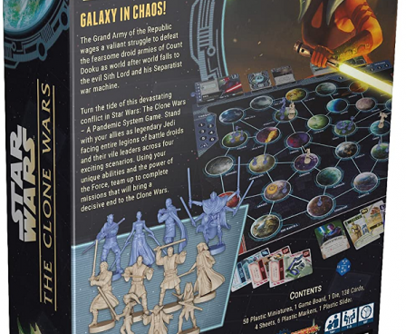 *A NEW PANDEMIC SYSTEM GAME SET IN THE STAR WARS UNIVERSE: The Grand Army of the Republic is in continuous conflict with the unending waves of Count Dooku’s droid battalions. In Star Wars: The Clone Wars – A Pandemic System Game, stand together as legendary Jedi against the Sith Lord and his Separatist forces.