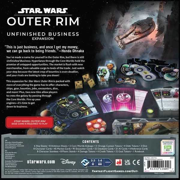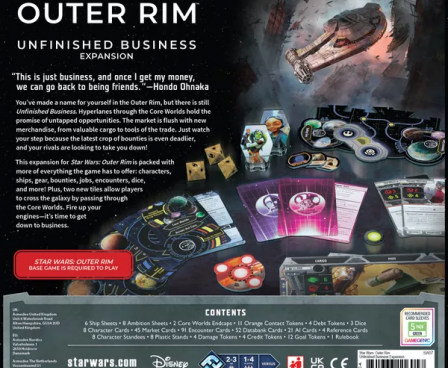 Unfinished Business, an expansion for Star Wars: Outer Rim, is packed with more of everything the game has to offer: characters, ships, gear, bounties, jobs, encounters, dice, and more! Two new tiles allow players to cross the galaxy by passing through the Core Worlds, and the new “favors” and “ambitions” change up how the game is played. Fire up your engines—it’s time to get down to business.
