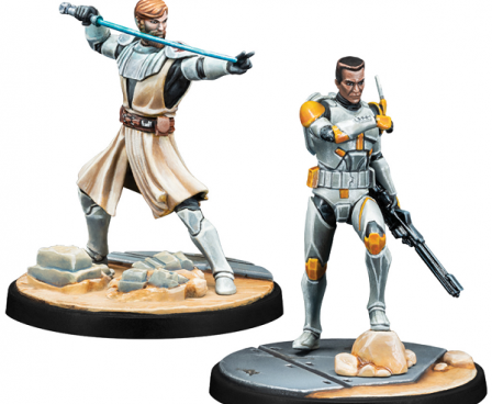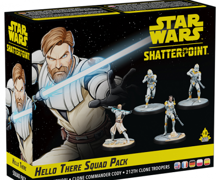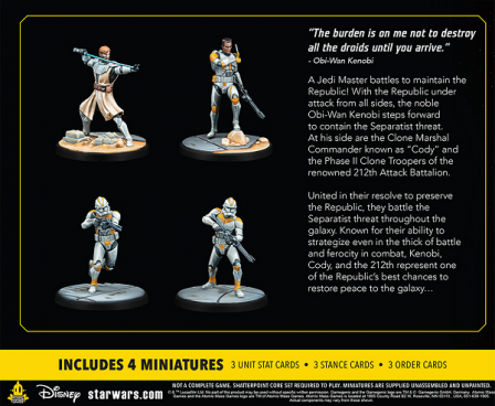 A iconic Jedi General and his allies enter the Star Wars: Shatterpoint in this pack! One of the Republic's most iconic heroes, Obi-Wan Kenobi fights to contain the Separatist threat no matter the cost and this pack adds him, Clone Commander Cody, and two Phase II Clone Troopers from the renowed 212th Attack Battalion to Star Wars: Shatterpoint. Whether using them together as full squad or combining them with other characters, the beautifully sculpted miniatures in this pack are accompanied by the Unit, Order, and Stance cards players need to unleash their unique abilities on the battlefield.