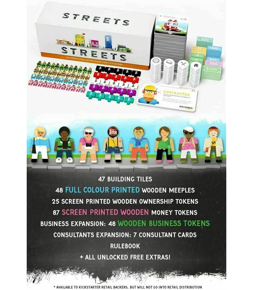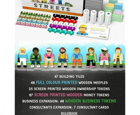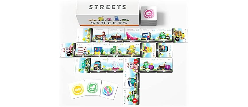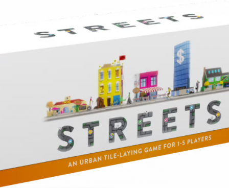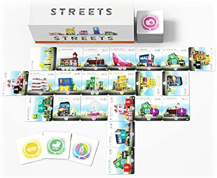 Streets is a tile-laying game where players build a city together. Each building has a simple valuation formula which earns money for the owner when the street is scored.