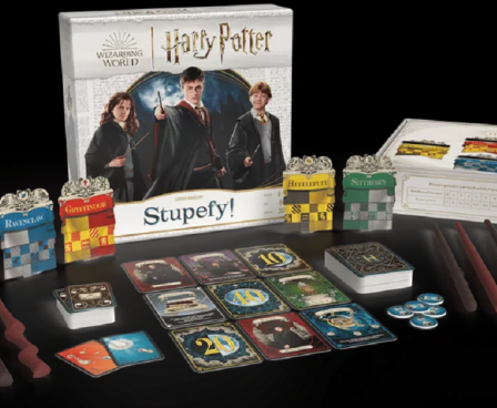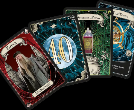 Spells are represented by cards that players receive at the start of the game. There are Stupefy! cards and Misspell cards (it happens to the best of us). Be careful, you start with a limited number of Stupefy cards and must balance your Misspells to become your professor’s favorite, collect potions, or even point cards. Avoid being Stupefied by your opponents along the way, otherwise you’ll be known as the latecomer (penalty) of your House and miss the chance to gain extra rewards. After 8 rounds, once all the rewards have been claimed, the House with the highest score wins the game.