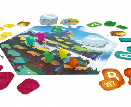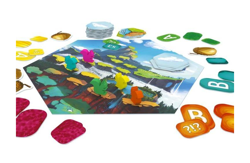 In more detail, each player has a hand of hexagonal cards, with words or phrases in three color blocks on the card. On a turn, you choose a player that has a token in front of them, take that token, then present them with a question by choosing one of the three question prompts (which are all color-coded), then choosing two cards from your hand and adding the properly-colored section of those cards to the question. A sample question: "What would you miss more if it ceases to exist: Facebook or doors?" That player secretly votes on A or B, while everyone else but the questioner secretly votes A or B depending on how they think the person will answer; a voter can optionally add their 3x scoring token to their vote.