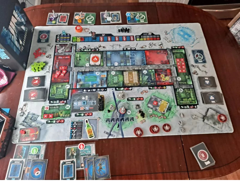 The Thing is a game that mixes different mechanisms to create an experience that is as faithful as possible to that of the original film. It is a "hidden role" game, in which one player is initially the Thing and the others players are humans. The purpose of the Thing is to infect others, to prevent the survivors from escaping from the base (which can happen three different ways), or to try to escape with them by behaving as a human.