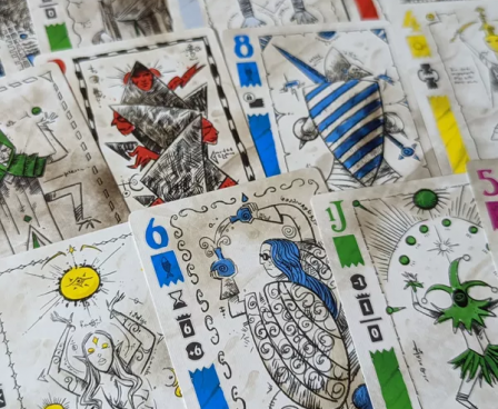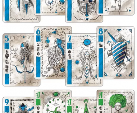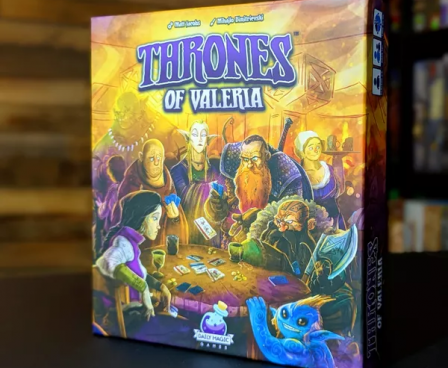 Thrones of Valeria reflects the tug-of-war between the great houses in the earliest days of the Kingdom. When printed, the game will be presented as a traditional card game with a deck made up of five suits of cards numbered 1 to 9, plus three special Jesters. The game will also feature a Standings Board and chunky ""mahjong-style"" House tiles to reflect the relative power of each house throughout the game. A draw bag for the House tiles and an assortment of coins will also be included.