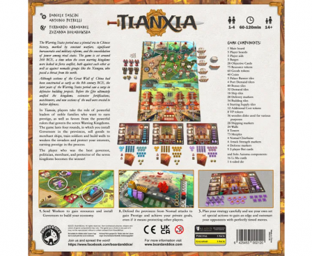 The game lasts four rounds in which you install Governors in the regions and bolster the power of rival ruling houses, thus gaining their favor. You also sell goods to merchant ships that sail the Chinese shores to gain wealth and other benefits. Nevertheless, you must not forget about the nomadic warriors who pose a constant threat on the northern borders of the seven kingdoms. Thus, you must train soldiers and build walls and towers to weaken the invaders and protect your interests, earning prestige in the process.
