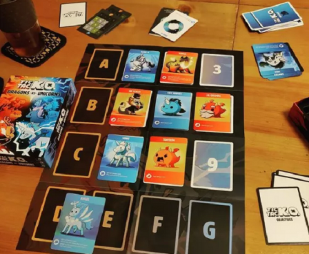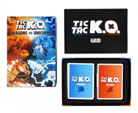 In Tic Tac K.O., two teams battle for control of the Grid by playing Character and Magic cards featuring diabolical Dragons and unforgiving Unicorns. Players lay down cards one at a time on the tic-tac-toe grid to match the pattern on their Objective Cards.