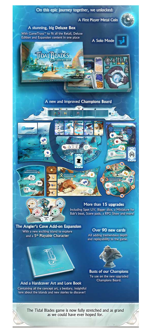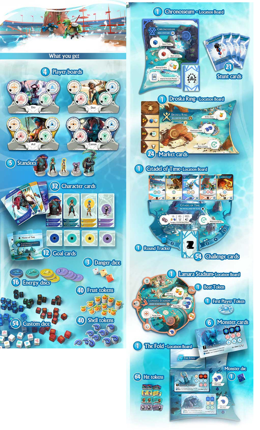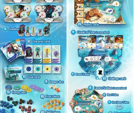 In Tidal Blades: Heroes of the Reef, each player takes the role of a young hero competing to be named a Tidal Blade. The tournament takes place over 5 Days and Nights. By gathering the needed resources, signing up to compete in Challenges and timing your arrival at different islands you can make the most of your Hero’s turns and rise in the ranks of the contestants.