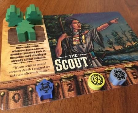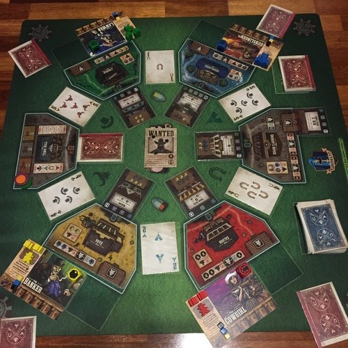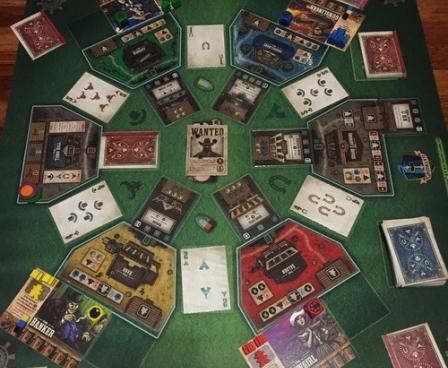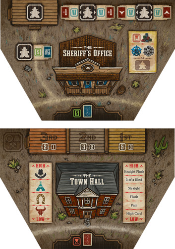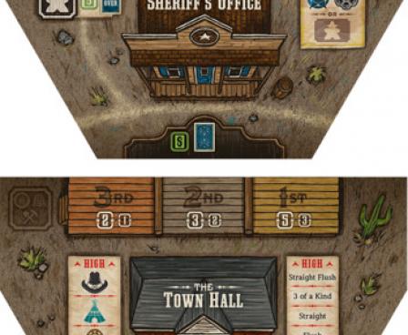 GAMEPLAY: The game is played in a series of rounds. Each round, poker cards are dealt between the locations, which are laid out in a circle. Players place posse members on these location cards, which will both give an action and count as a bid for the location's valuable resources. Players also get a poker card of their own which uses the two adjacent cards from a location to form a three-card hand. This creates a clever mix of modern worker placement and poker that drives the game. In addition, players must manage their resources of Law, Money and Force to buy buildings and gunfight. If you have the highest stake in the most lucrative industry at the end, you will be rewarded bonus points. Add these points to the points you've collected from buying buildings and determine the winner! Yippie kay yay a!