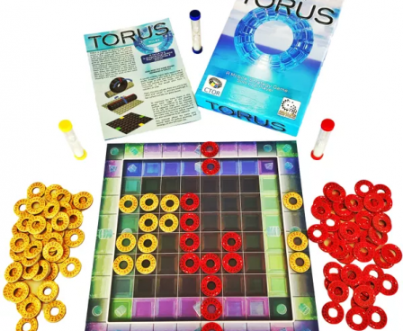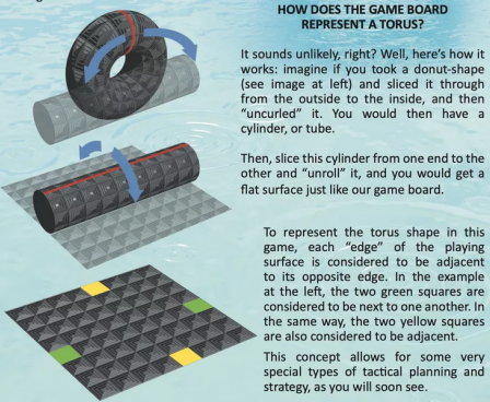 The goal is to surround your opponent's play pieces and flip them to your color through strategic placement and movement on a toroidal shape, represented by the 100 square flat game board.