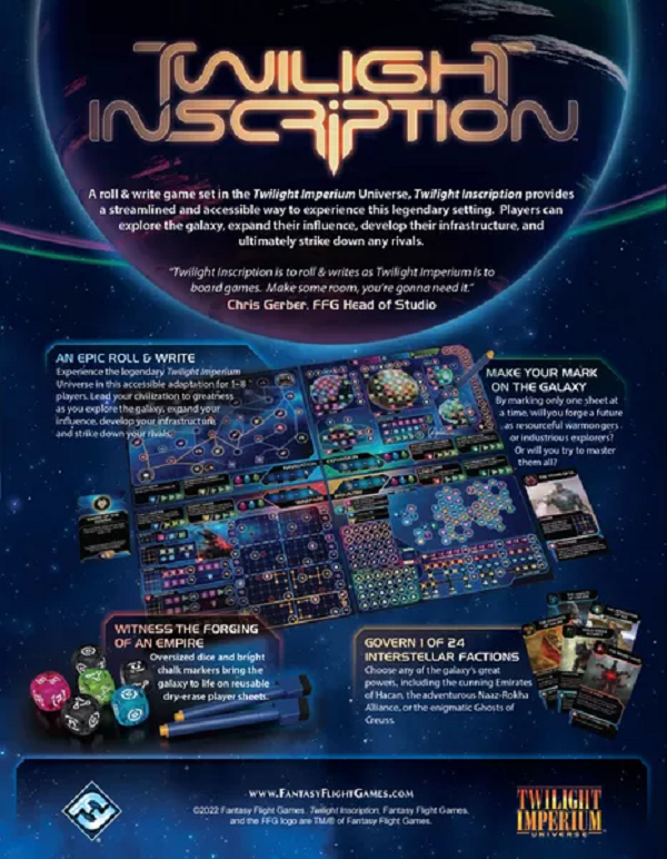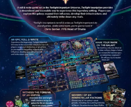 Twilight Inscription, an epic roll-and-write game for one to eight players, offers an experience unlike anything Fantasy Flight Games has done before. With a limited pool of resources at your disposal, you’ll need to carefully manage Navigation, Expansion, Industry, and Warfare as you amass victory points and earn your right to the throne on Mecatol Rex. Will your faction become the new rulers of the galaxy? Or will your fledgling empire fade into obscurity? Anything can happen in this strategic, infinitely-replayable game!