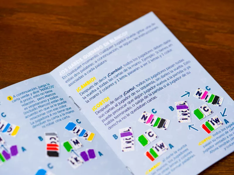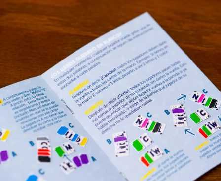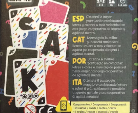 Everybody has a hand of six cards; cards have a letter on one side and a color on another, and you have to hold your cards however they're dealt to you. Place one card from the deck letter side up and another color side up. When the timer starts, everybody plays at the same time. You can play a letter on the letter pile as long as you can name something that starts with that letter and that "matches" the current color showing; similarly, you can play a color on the color pile as long as you can name something of that color that starts with the letter atop the letter pile. For example, when playing a "B" card next to a yellow card, you could say "Banana!", and when playing an orange card next to an "L", you could say "Lion!" You can't repeat a word previously given, and you can't name the color of the color card.