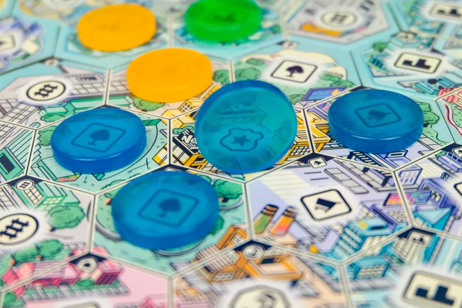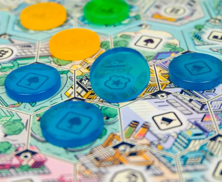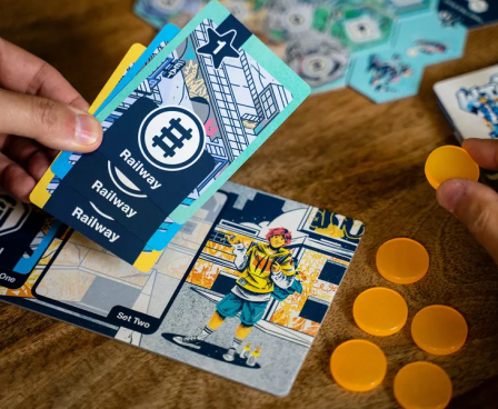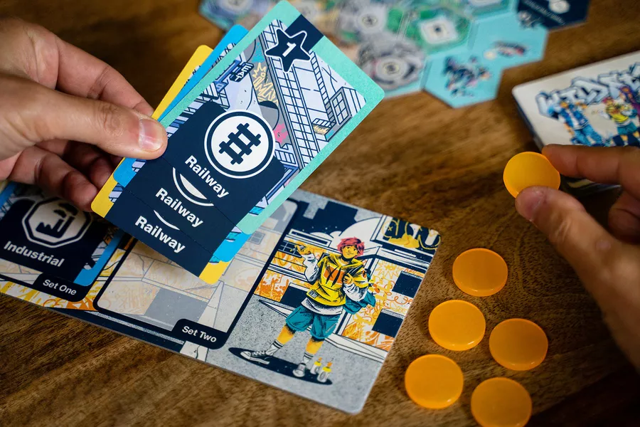 The goal of the game is to tag locations across the city's districts with your crew's color. You'll do this by collecting sets of cards with matching location icons. Each time you collect a set of 3 cards that all have the same icon, you get to place a tag on a hex with that icon anywhere on the map.