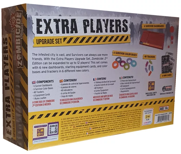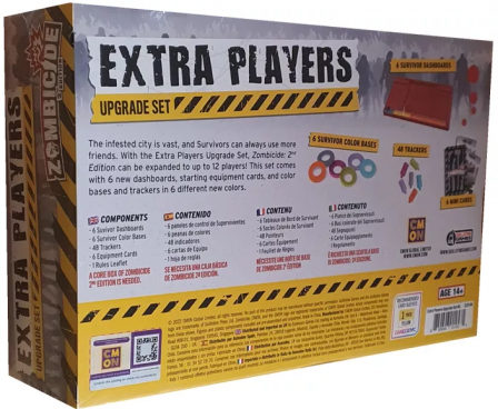 7–12 Players 60–120 Min Playing Time Age: 14+ With this set, Zombicide 2nd Edition can be expanded to accommodate up to 12 players. This set comes with 6 new dashboards, staring equipment cards, colors and bases in 6 different new colors, and rules for adding additional players.