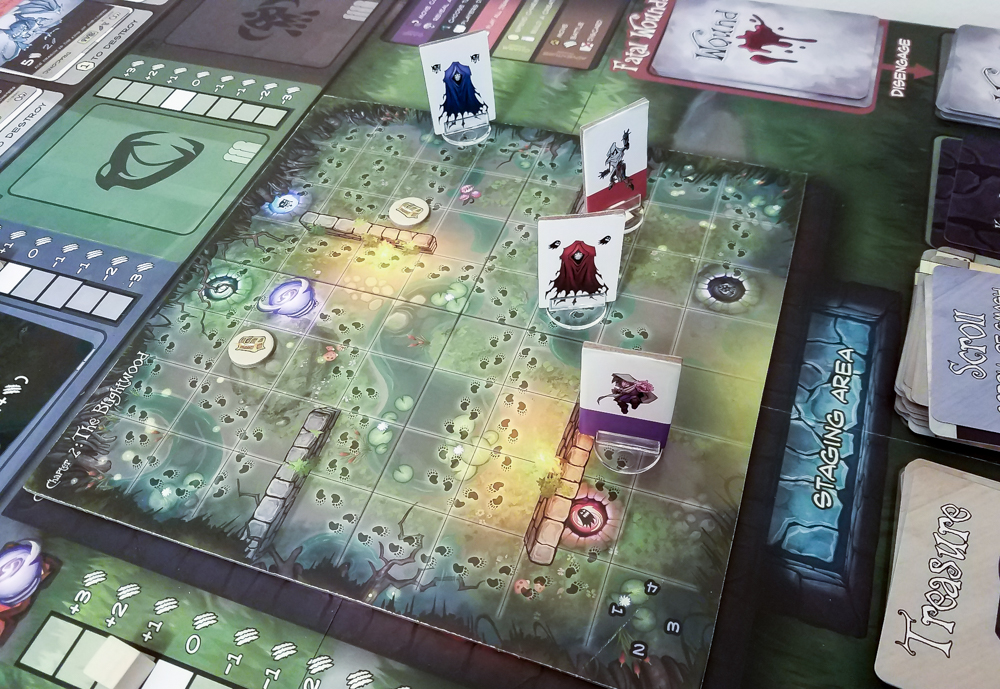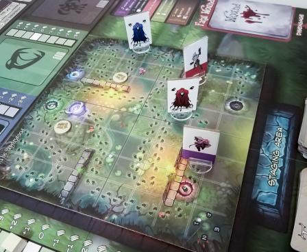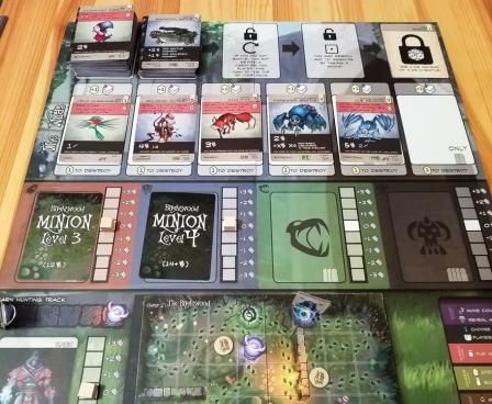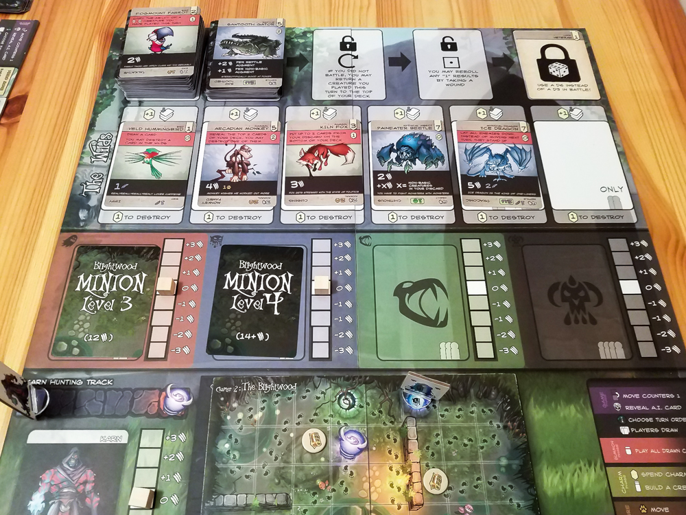 Direwild is a fully co-operative, tactical, dungeon-crawling deck-builder. There is no dungeon master; it is purely the players vs. the game. Players assume the role of animists, heroes that can summon creatures both great and small (represented in the cards you build your deck with), then combine those creatures in unique ways. With the creatures' help, the animists strive to work as a team to defeat the evil forces of Karn. Karn was once a great animist himself, but was corrupted by his lust for greater power. Throughout the game, Karn tries to hunt the heroes and defeat them before they can grow strong enough to face him in the final showdown. The game is split into three chapters, with a "game save" mechanism to allow for the packing and saving of the game between game nights.