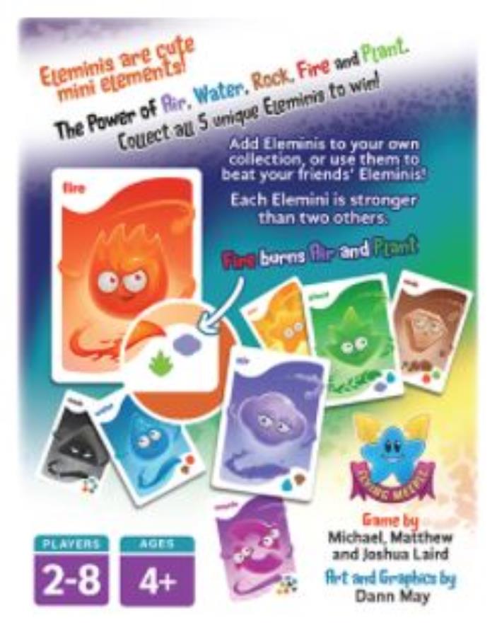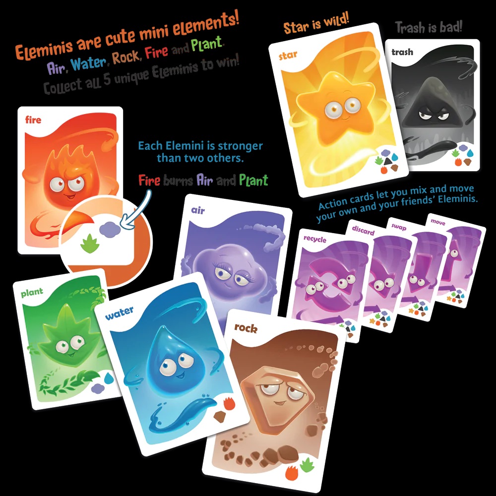Each element outranks two other elements, similar to rock/paper/scissors/Spock/lizard. You can play an element card you draw in any empty space or replace a weaker element with the new one; you can play in your row or an opponent's. A star element is wild and can represent any element you need; a trash card can replace any element and can be displaced only by a star or an action card.