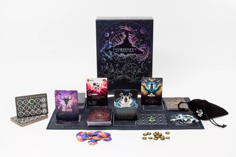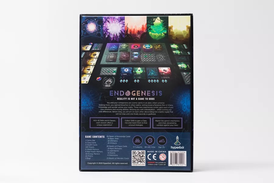 Endogenesis is a strategic card game that can be enjoyed competitively, cooperatively or through solo play. Collect skills from the Realm of Knowledge to customize your character with different powers, and upgrade them with Shards that you can earn by defeating your enemies. Also joining the fray are vicious monsters from the Realm of Chaos. The most powerful of these are called Legendaries; killing them rewards its slayer with a prism. Be the first to collect three Prisms and you win!