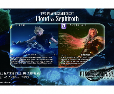 AVERAGE PLAY TIME: 20 min RECOMMENDED AGE: 13+ Straight out of the new FINAL FANTASY VII REMAKE comes a brand-new FINAL FANTASY TCG Two Player Starter Set where you and a friend can face off as two of the most iconic video game characters of all time, Cloud Strife and Sephiroth! This set includes powerful new cards exclusive to this Starter Set that can be enjoyed by beginners as well as seasoned players. It also features Full Art Variants of FINAL FANTASY VII REMAKE Cloud and Sephiroth which collectors will want to get their hands on! Starter sets include: Two 50 card decks [Including one (1) Full Art Variant Cloud, and one (1) Full Art Variant Sephiroth] One set of rules With one of our Two Player Starter Sets, you’ll have everything you need for two players to jump right into the FINAL FANTASY TRADING CARD GAME.