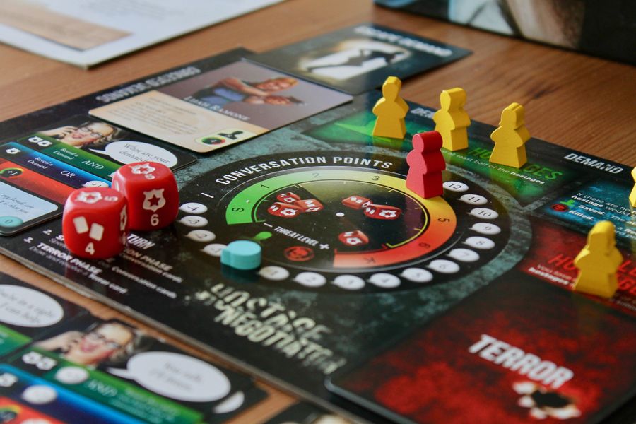 In Hostage Negotiator: Crime Wave — a standalone expansion to the solitaire game Hostage Negotiator — each turn represents a conversation between you and a hostage taker. You play cards and roll dice to increase conversation points, decrease the threat level, and release hostages.