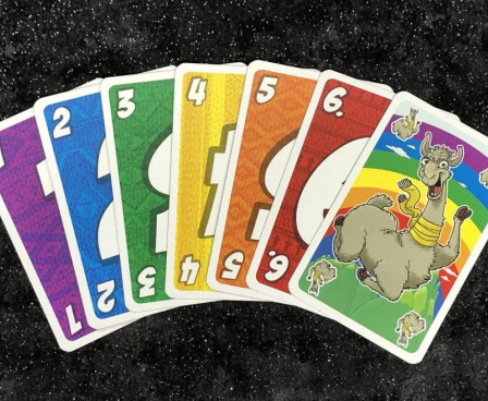 Each player starts a round with six cards in hand; the deck consists of llama cards and cards numbered 1-6, with eight copies of each. On a turn, the active player can play a card, draw a card, or quit. To play a card, you must play the same number as the top card of the discard pile or one number higher. If a 6 is on the discard pile, you can play a 6 or a llama, and if a llama is on top, you can play another llama or a 1. If you quit, you place your remaining cards face down and take no further actions in the round. If all players have quit but one, that player can continue to play, but cannot draw more cards.
