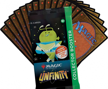 Each Unfinity Collector Booster contains 15 Magic: The Gathering cards and 1 double-sided traditional token, including 1 traditional foil draw card, 1 traditional non-game foil reprint, 1 Galaxy Foil full-art space land (replaced by a Galaxy Foil Borderless Shock Land in 4% of packs) and 1 Foil Traditional Land (replaced by a Shock Land Borderless Traditional Space Land in 4% of packs). Each Unfinity Collector Booster contains a total of 3-5 Galaxy Foil cards and 10-12 traditional foil cards.