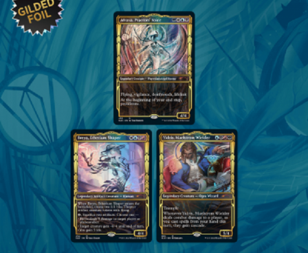 The days move fast in the not-so-pristine metropolis of New Capenna. Here, crime always pays, and business is booming. We’re not sure how they got here, but somehow three of Magic’s most popular legends have found themselves embroiled in what can only be described as a “what if” scenario. What would Atraxa, Breya, and Yidris be like on the mean streets of New C? Julie Dillon, Krharts, and Tom Roberts have an idea, and now you can too. These cards feature the beautiful Gilded Foil treatment from the Streets of New Capenna set, and that’s the kind of hardware that catches attention. Please note this drop is available only in foil.