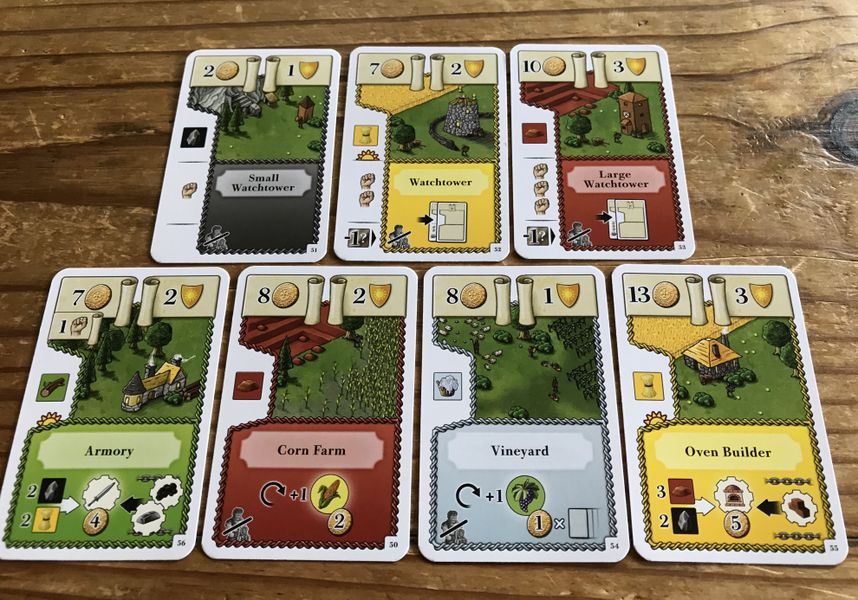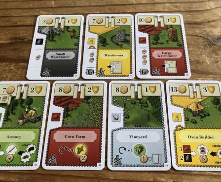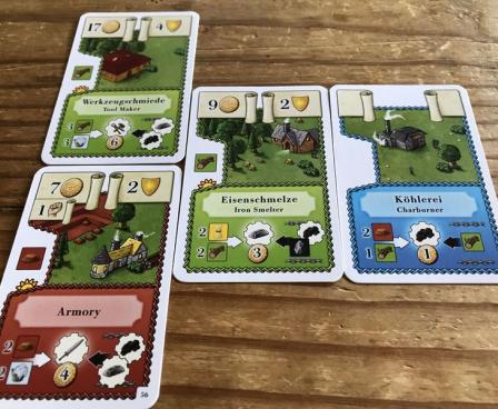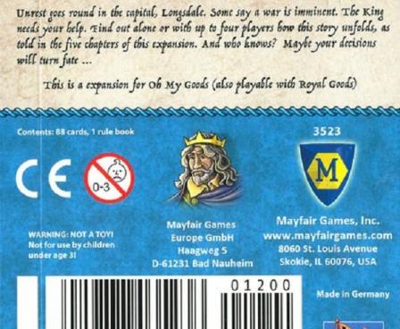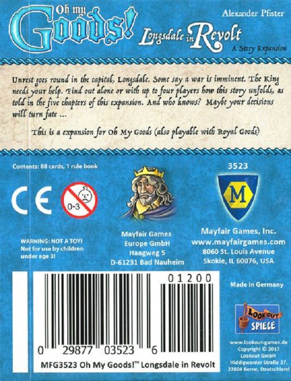 Oh My Goods!: Longsdale in Revolt, an expansion for Oh My Goods!, consists of five chapters that together tell a single story. The length of the game is now not fixed, but depends on the current chapter, which has an event deck that will be compiled differently each time you play. The expansion also includes four character cards, 34 new buildings (in seven types), 22 event cards (in both German and English), and 14 chapter cards (ditto).