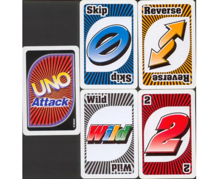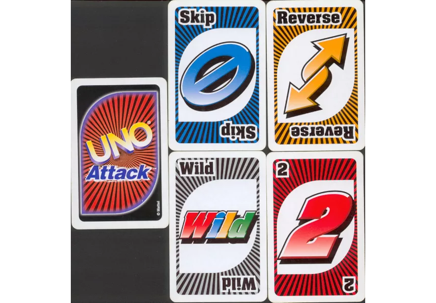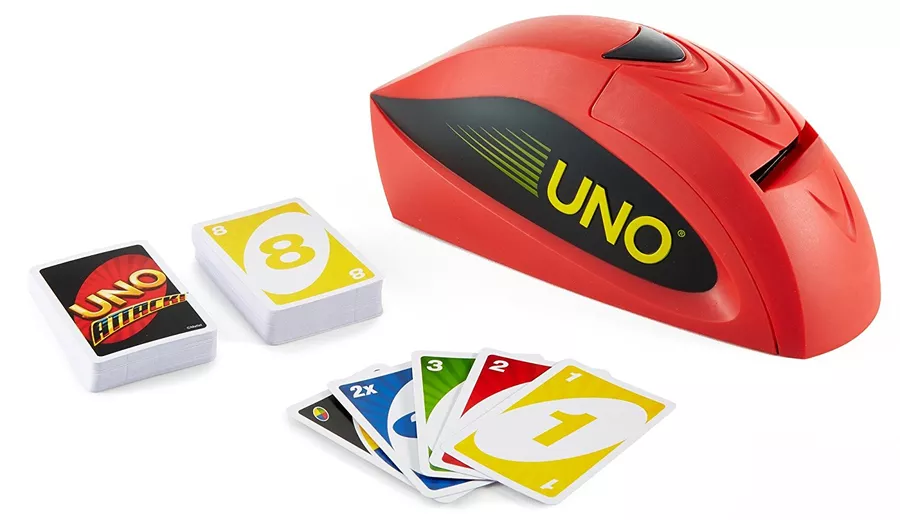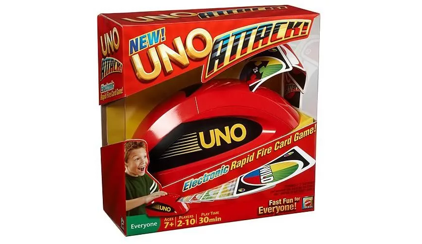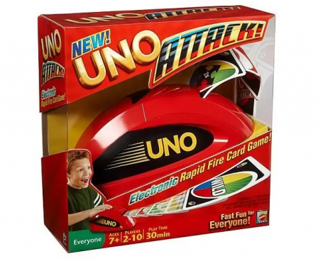 You'll still encounter all the elements that make UNO so unpredictable and challenging, but add to that a motorized card launcher that shows no mercy and you've got UNO Attack. The object of the game is still to get rid of all your cards. The UNO command cards direct the game by telling players when to trade hands, discard, reverse the playing order, or skip a player. Beware the dreaded Hit command, though, as this translates into a game of Russian roulette. You never know when the card launcher is going to fire off a stream of UNO cards just for you! For 2 to 10 players. Requires three C batteries (not included).
