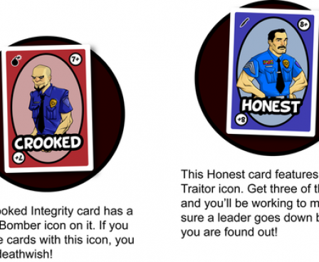 In Good Cop Bad Cop: Bombers and Traitors, an expansion to the hidden identity and deduction game Good Cop Bad Cop, players may still be either Honest or Crooked cops, but two new roles are added: Traitor and Suicide Bomber. Honest and Crooked players are still trying to eliminate the opposing team's leader to win the game, the Suicide Bombers are trying to be eliminated before the leaders, and the Traitors are trying to remain alive when one of the leaders goes down.