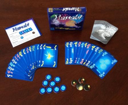 Hanabinamed for the Japanese word for "fireworks"is a cooperative game in which players try to create the perfect fireworks show by placing the cards on the table in the right order. (In Japanese, hanabi is written as ; these are the ideograms flower and fire, respectively.)