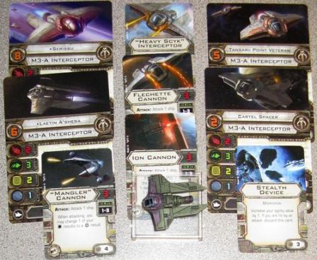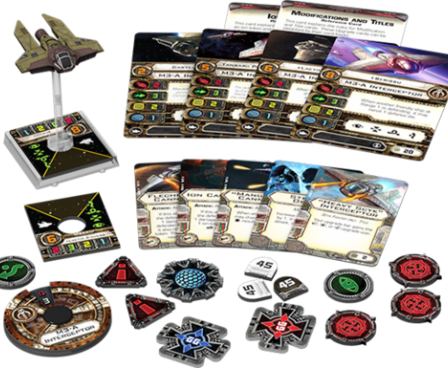 The M3-A Interceptor Expansion Pack part of the sixth wave of starship expansions for the Star Wars: X-Wing Miniatures Game includes one pre-painted M3-A interceptor miniature, four ship cards, and five upgrades, allowing you to fly this ship as a nimble low-budget Scum faction fighter or as a "Heavy Scyk", capable of equipping a cannon, torpedoes, and missiles.