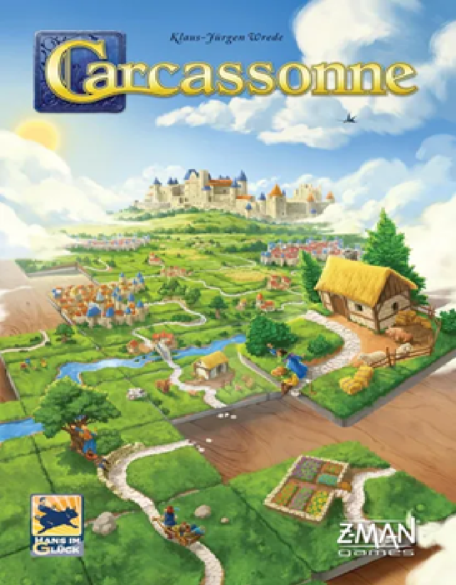 Carcassonne is a tile-placement game in which the players draw and place a tile with a piece of southern French landscape on it. The tile might feature a city, a road, a cloister, grassland or some combination thereof, and it must be placed adjacent to tiles that have already been played, in such a way that cities are connected to cities, roads to roads, etcetera. Having placed a tile, the player can then decide to place one of his meeples on one of the areas on it: on the city as a knight, on the road as a robber, on a cloister as a monk, or on the grass as a farmer. When that area is complete, that meeple scores points for its owner.
