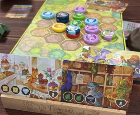 Flamecraft Duals is a two-player abstract pattern-building game that takes about 30 minutes to play. Each round, a player draws a dragon from the bag and places it on the shared central board. Every dragon type has a special ability that can be fired up to draw more dragons or rearrange those already on the board. You want to match three dragons on the board to the pattern on the shop cards in your hand to score them. Once all the dragons are drawn from the bag, the game ends and the player with the highest score wins.