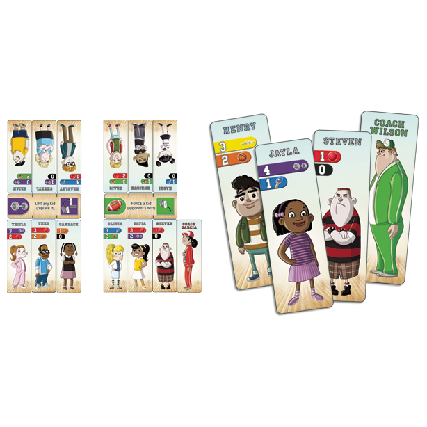 In GYM, players play on 1 of 2 teams, which can accommodate 2, 4 or 6 players. There are 2 phases to the game. The "Pick" phase is just like Gym class! Each team member will choose a Kid from the line up to add to his hand. If a "brat" is acquired, a team member is allowed to influence which 4 (of the 6) events will be played in the next phase. In the "Play" phase, each team member will play a Kid to one of the 4 events on his turn. Playing Kids will also allow an "event action", which may manipulate player hands, Kid positions, and more. Playing a "brat" allows a team mate to reposition a Coach, which reduces chaos at an event, but also makes it more difficult to make changes to the roster. In the end, the team with the most cumulative points from the 4 events is the winner!