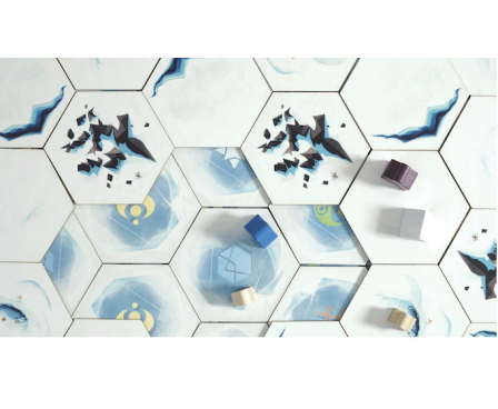 Players are archeologists exploring tiles they can remove. There are 5 levels of tiles in the game. The first one corresponds to the ice sheet level. The second, third and fourth represent surface, intermediate and deep artifacts levels. the last one is the edifice level. Archeologists dig these tiles in order to collect artifacts which gave them reputation points. The ice sheet tiles removed by a player can be played as a helping action for him. The tiles are game changing rules and represent legacy material to discover as we go along.