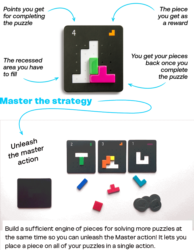 The core of the game lies in using your pieces to complete puzzles. Starting with just two basic pieces, you use three actions every turn to develop a powerful engine. With more pieces of various types, you can efficiently complete even the most difficult puzzles. The puzzles you complete award you points or new pieces to further fuel your engine.