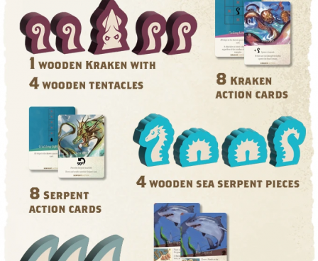 The Sea Monster expansion adds monster modules with cards and sea monster pieces along with additional captains to the core gameplay experience.