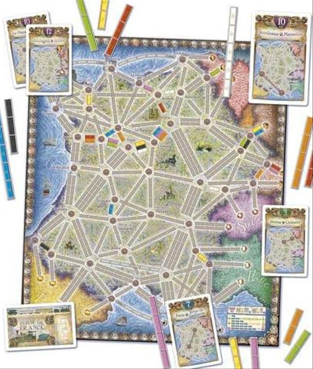 In the France half of this expansion, 2-5 players collect train cards and claim routes in order to complete tickets in hand, but most of the tracks on the board aren't colored! Each time that you draw cards, you must take a colored tile that's 2-5 train cars long and place that tile on an empty track bed. Once you've done this, any player can claim that route by discarding the appropriately colored cards from hand, as in any other Ticket to Ride game. (Single-length routes are already colored, and the map contains a number of gray-colored ferry routes.)