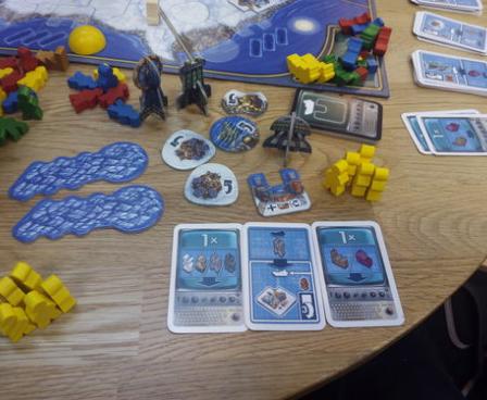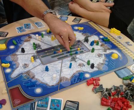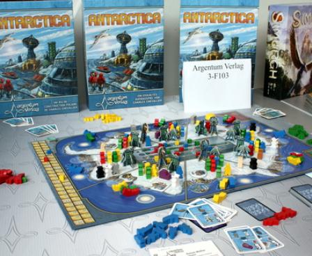 Your objective in Antarctica is to develop research centers in Antarctica and to mine resources for research purposes only, of course. The sun orbits Antarctica counter-clockwise, and each ship it thaws moves on for scientific progress. At the end of the game, victory points for all kinds of majorities are granted. Will your consort be the one that gained a fortune ... er, has done most to rescue mankind?