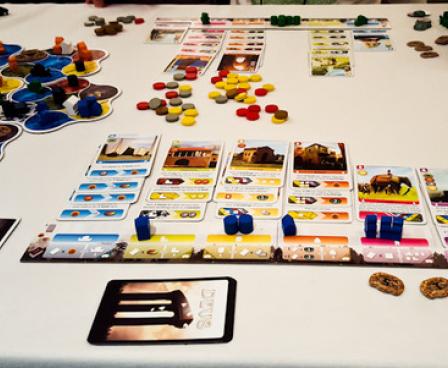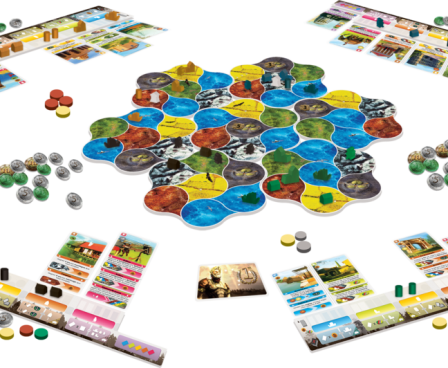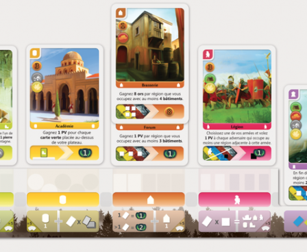 When you construct a building, you build it in the appropriate location on the modular game board which is sized based on the number of players with the hexagonal tiles composed of seven landscape "circles" then you place the card in your personal tableau in the appropriate stack of colored cards and activate the power of all of those cards already in your tableau, starting with the card at the bottom of the stack.