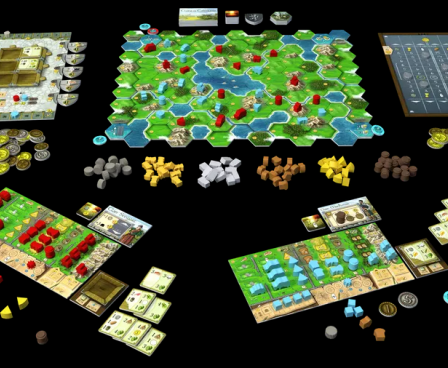 The game comes with eight different clans, a modular board with 16 configurations, eight port bonuses and eight round scoring tiles.