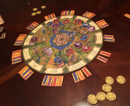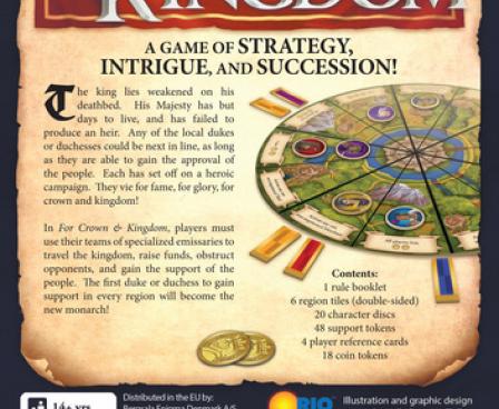 In For Crown & Kingdom, players must use their teams of specialized emissaries to travel the kingdom, raise funds, obstruct opponents, and gain the support of the people. The first duke or duchess to gain support in every region will become the new monarch!