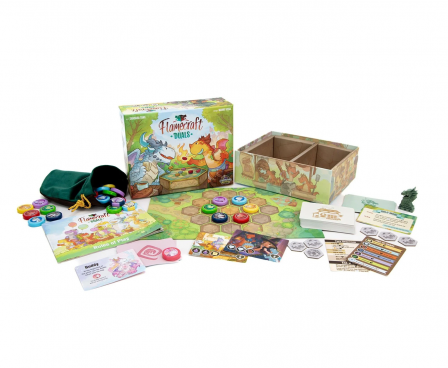 Flamecraft Duals is a two-player abstract pattern-building game that takes about 30 minutes to play. Each round, a player draws a dragon from the bag and places it on the shared central board. Every dragon type has a special ability that can be fired up to draw more dragons or rearrange those already on the board. You want to match three dragons on the board to the pattern on the shop cards in your hand to score them. Once all the dragons are drawn from the bag, the game ends and the player with the highest score wins.
