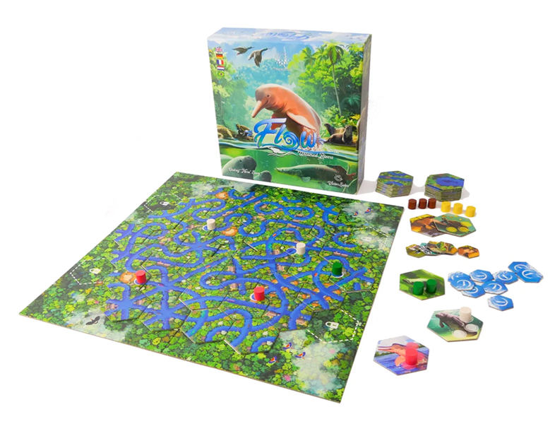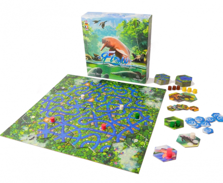 Flow: Untamed Rivers is a strategic tile-laying game in which players take turns placing a tile on the rainforest board. This gradually forms a river labyrinth, in which you always have to be attentive so that you don't miss a chance for yourself or overlook one of your fellow players. Each player has only 3 Lair Tiles, which can be used to build Territories. Therefore, it is important to carefully weigh up when to use them and when it is better to wait. However, if you wait too long, it can be too late and you end up with only one or two Territories. In addition, each player has one Reservation Marker, which reserves a field of the rainforest board until the end and can be worth its weight in gold if placed on the right field.