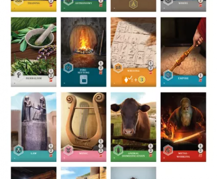 The game’s setting spans several millennia, a time span of thousands of years. Players go through eight ages, from the ancient to medieval ages, to the modern age, and finally to the near future, until the player with most fame wins. The game features more than 300 unique cards with more than 200 distinct illustrations showcasing historical inventions, buildings, and wonders. Your goal is to acquire the most advantageous cards to advance different aspects of your civilization, like research, military, population, prosperity, and culture.