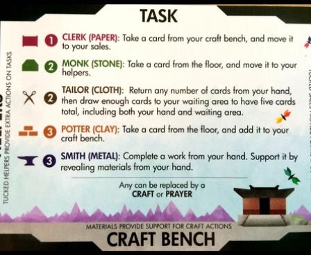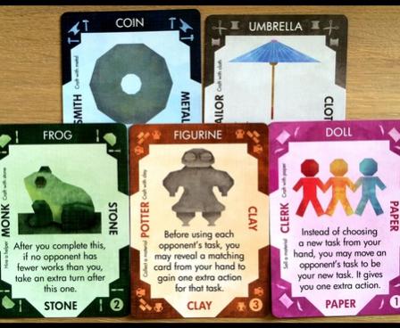 You choose tasks to allow you to perform actions, keeping in mind that other players will get to follow up on your task on their next turn. Clever planning and combining of your works' special abilities is key, as is managing which materials you sell.