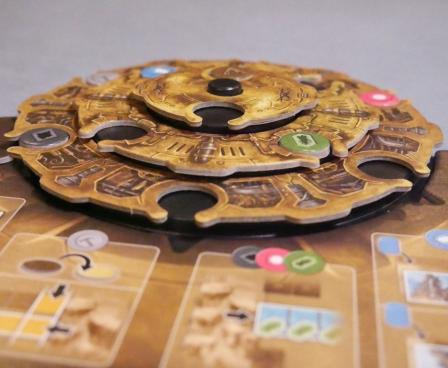 Noria is the debut title from Sophia Wagner, winner of the Spiel des Jahres fellowship in 2015. The talented, young author created an entirely new steampunk universe specifically for this game, and artists Michael Menzel and Klemens Franz have managed to bring her vision to life. At the center of the game is an innovative mechanism called "wheel building". Each player has an action wheel consisting of three rings, with slots for a number of different action discs. Over the course of the game, players try to obtain new discs and manipulate the rings of the wheel to optimize their action selection. Additionally, to ensure their investments bear fruit, they also need to bribe politicians with knowledge.